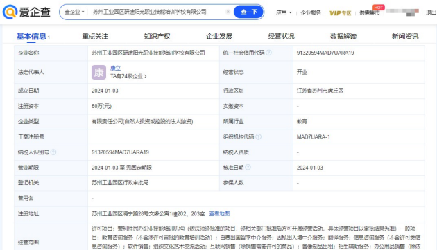 爱企查App显示,近日,苏州工业园区研途阳光职业技能培训学校有限公司成立,法定代表人为康立,注册资本50万元人民币,经营范围包括营利性民办职业技能培训机构、教育咨询服务、自费出国留学中介服务、因私出入境中介服务、翻译服务等。股东信息显示,该公司由苏州研途教育科技有限公司全资持股,后者由张子彪(张雪峰)持股约10.86%并担任监事。