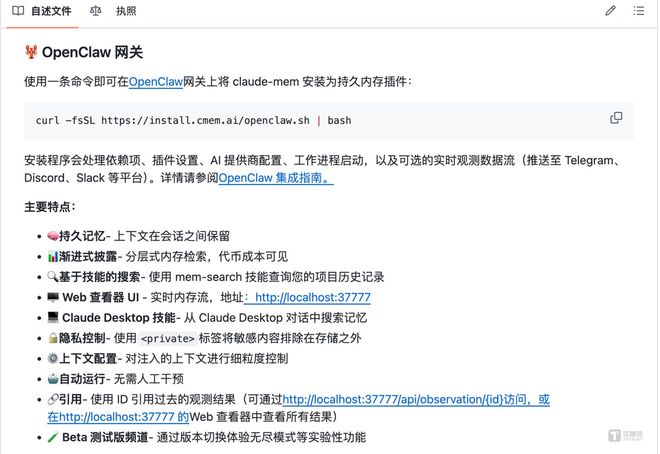 于是,Claude-mem专门发布了OpenClaw桥接插件。 两者的技术链路构成了极其硬核的算力威慑: OpenClaw负责提供无限循环、绕开官方界面的自动化Agent执行环境; Claude-mem则通过监听底层数据流实时压缩记忆,把原本高昂的重复Token读取成本直接抹平。