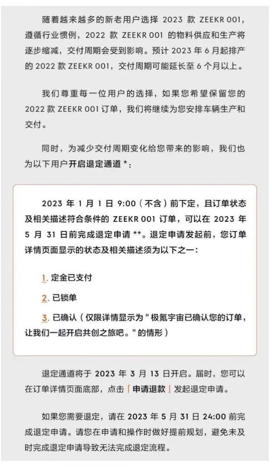 四、对于不愿意等待2022款极氪001、又不愿意将订单切换到2023款极氪001的用户,极氪将在2023年3月13日开启退订通道,退订得满足下面条件: